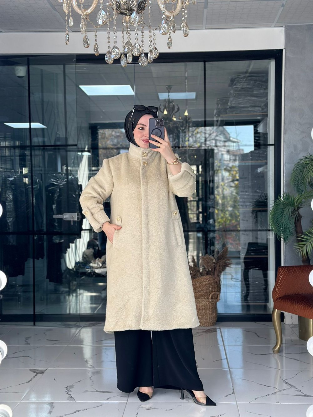 Kumaşı angora kumaştır. Önü gizli kapaklı düğmelidir.