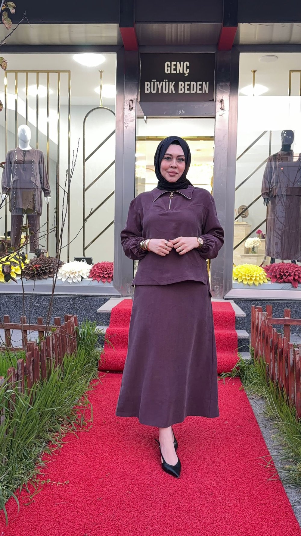 Kumaşı tenseldir. Tunik önü yarım fermuarlıdır. Etek beli lastiklidir.