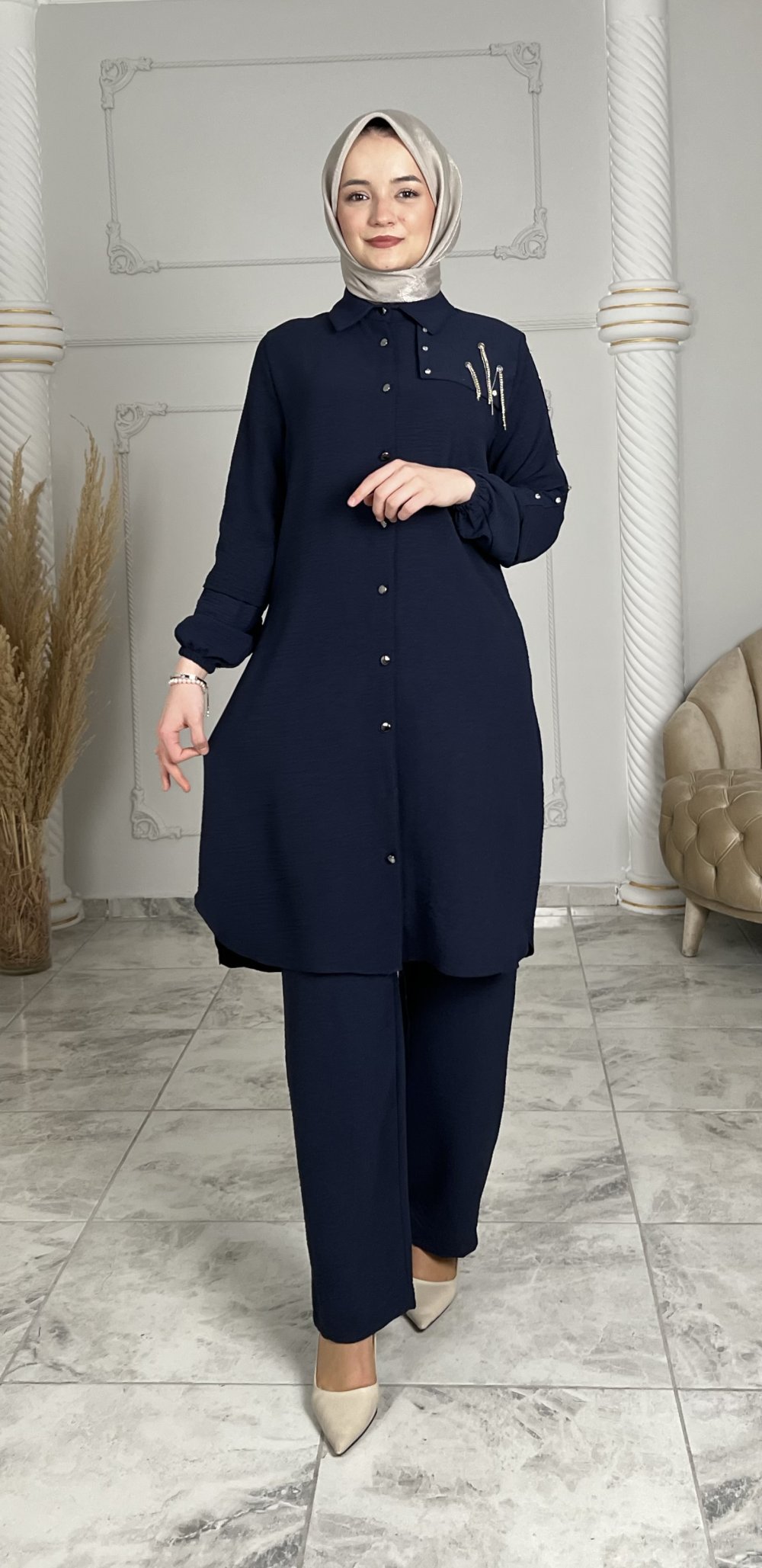Tunik boydan metal düğmeli taş zincir detaylıdır.