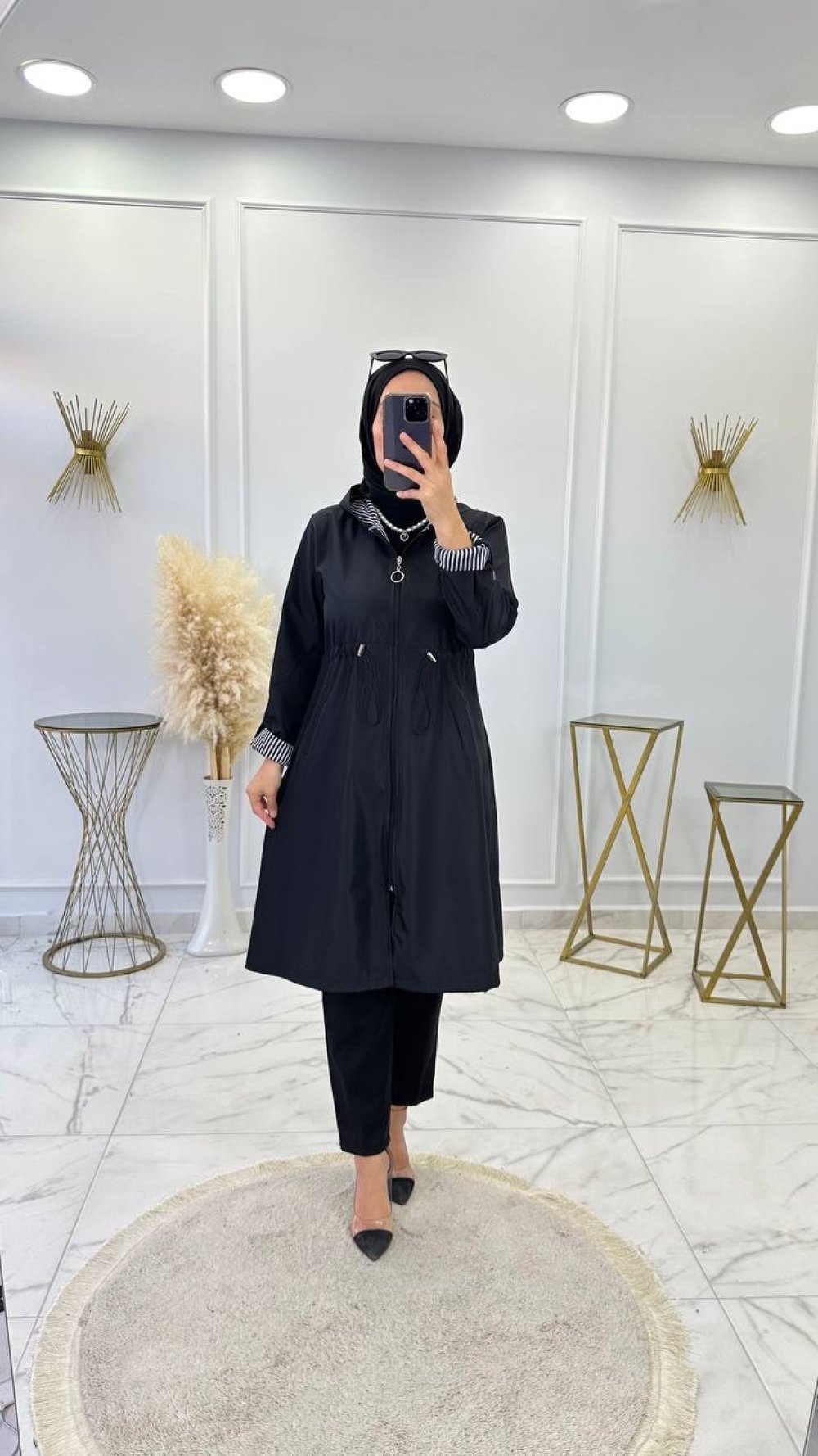 Çizgili astarlı, cepli, fermuarlı , bağcıklı, kapşonlu. Boy 105 cm