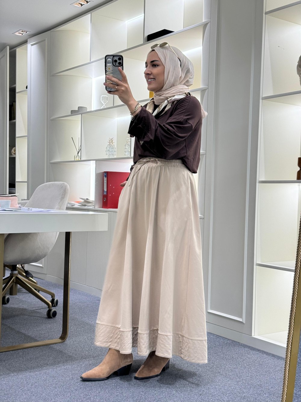 Dikiş Detaylı Beli Lastikli Etek Bej