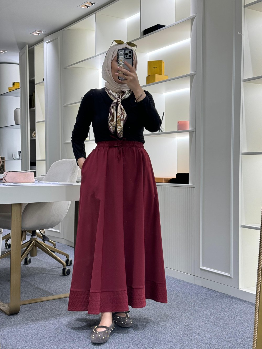 Dikiş Detaylı Beli Lastikli Etek Bordo