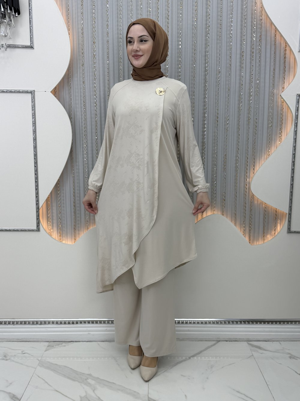 Gülümser Pantolonlu Takım Krem