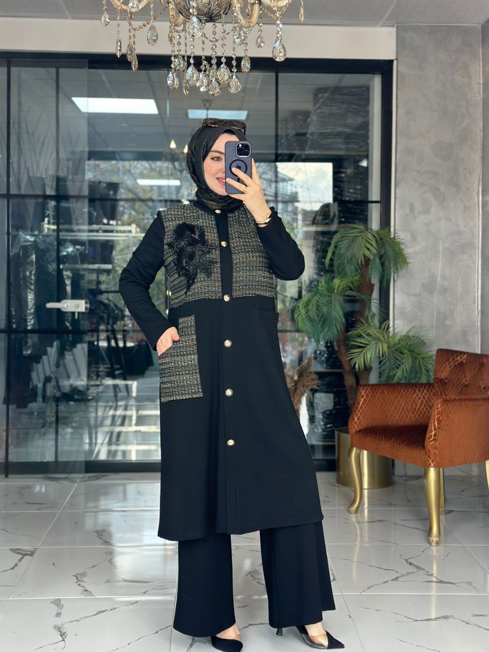 Kumaşı çeliktir. Önleri düğmelidir. Cepleri mevcuttur. Taşları yapıştırmadır.