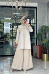 Gömlek Krep Jakar Kumaş,Pantolon Pırlanta Krep Kumaştır. Gömlek Ön Normal Patlı,Omuzlar Düğmeli,Gömlek Sağ Aplike Detaylı, Bolpaça,Rahat kalıptır.
