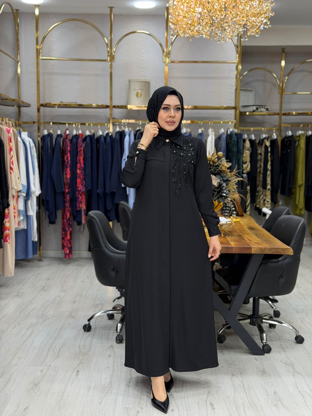 Kumaşı kreptir. Önü gizli düğmelidir. Taşları yapıştırmadır.