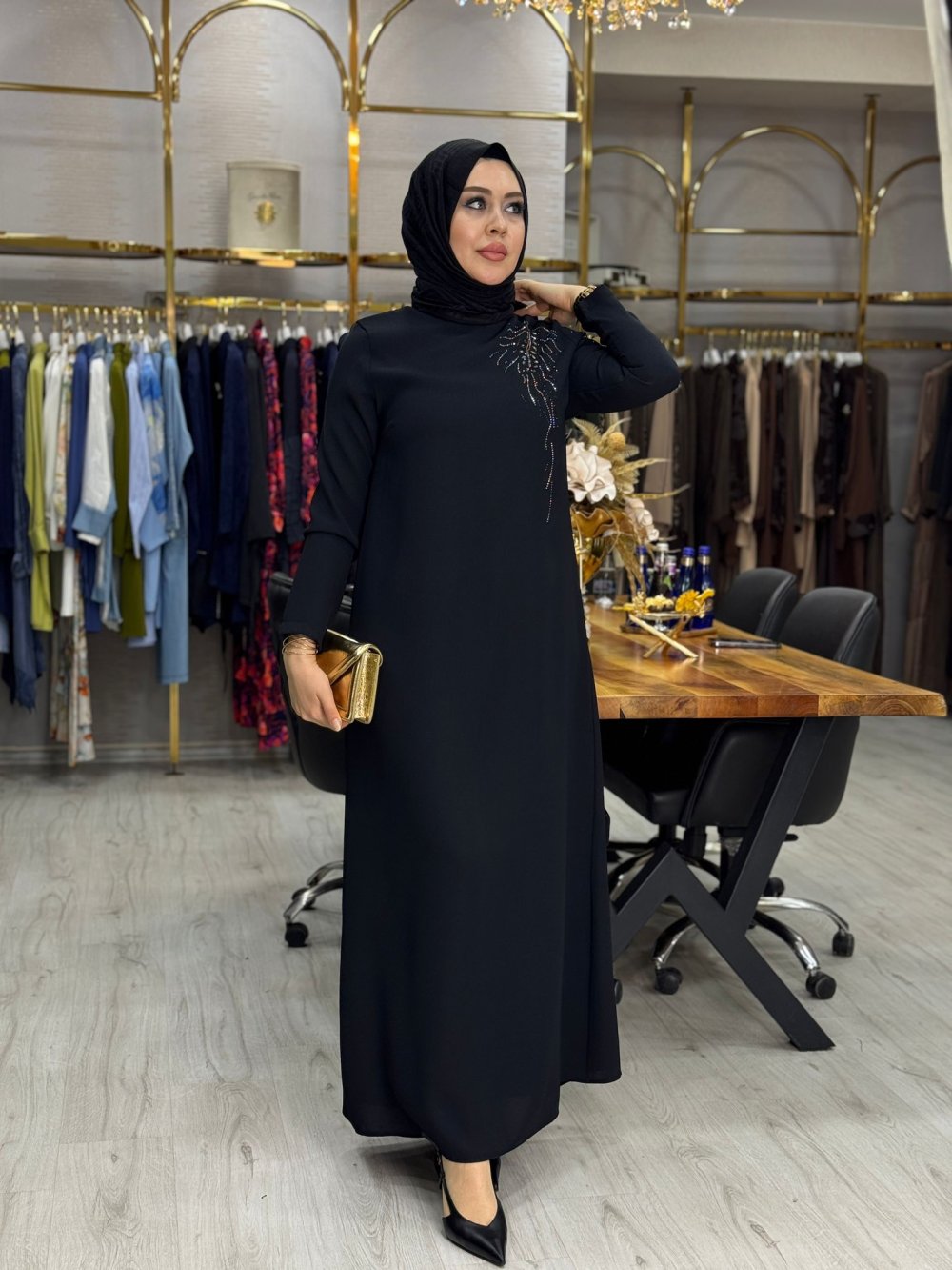 Kumaşı kreptir. Taşları yapıştırmadır. Arkası fermuarlıdır. Dar kalıptır.