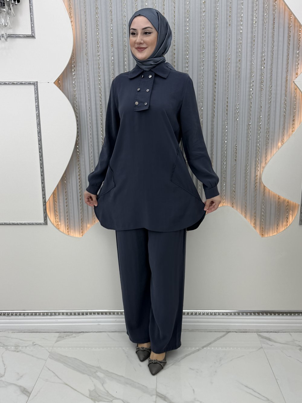 Tunik etek ucu yanlardan oval hafif yırtmaçlı