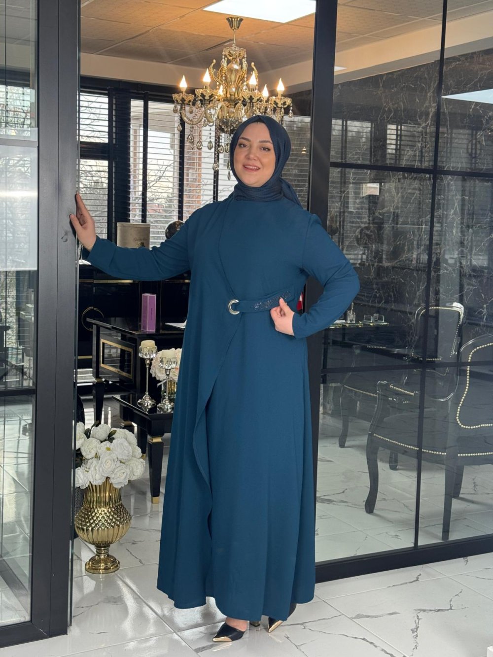 Kuş Gözü Detaylı Elbise-Petrol Mavisi