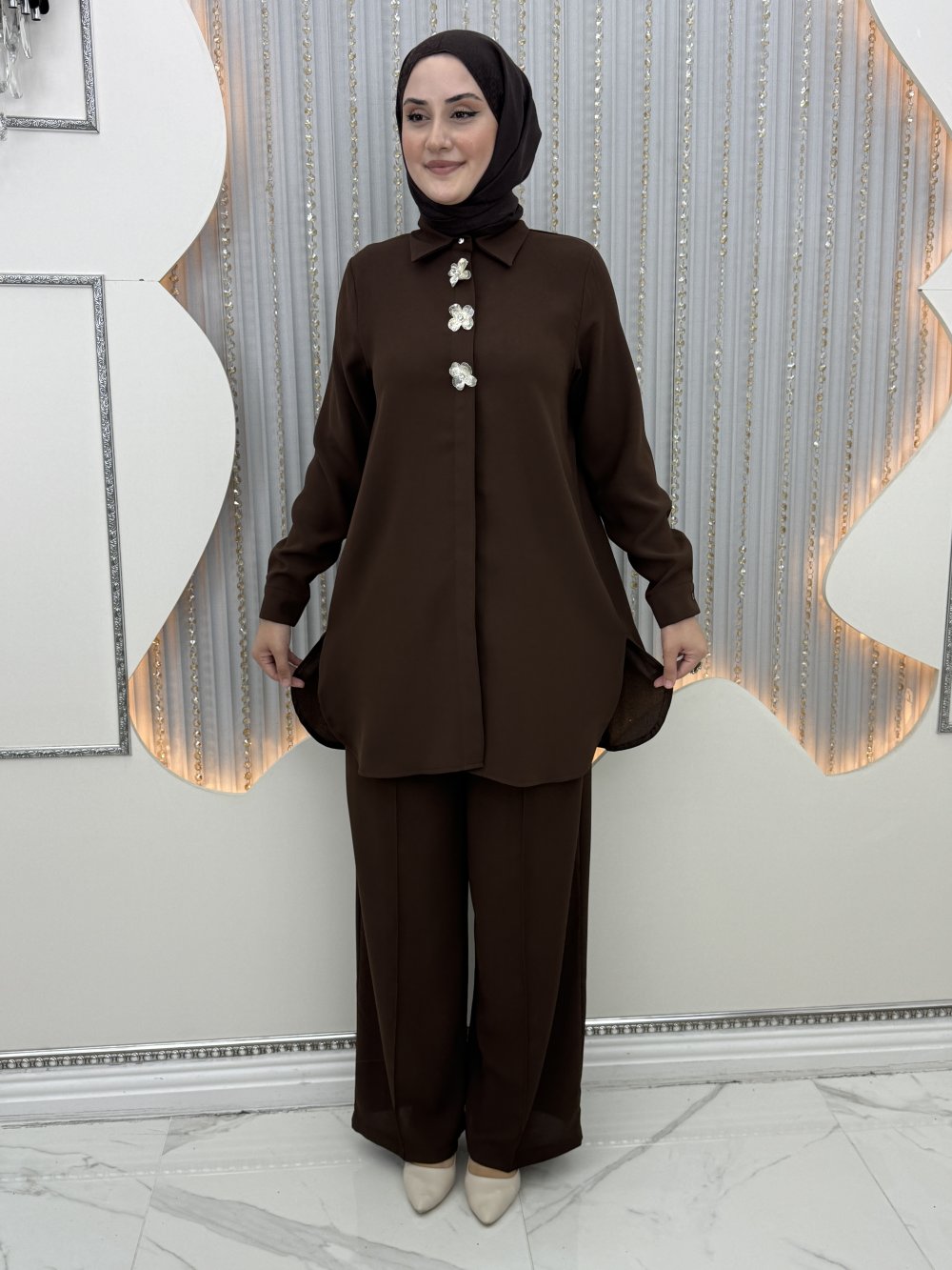 Menekşe Pantolonlu Takım Kahverengi