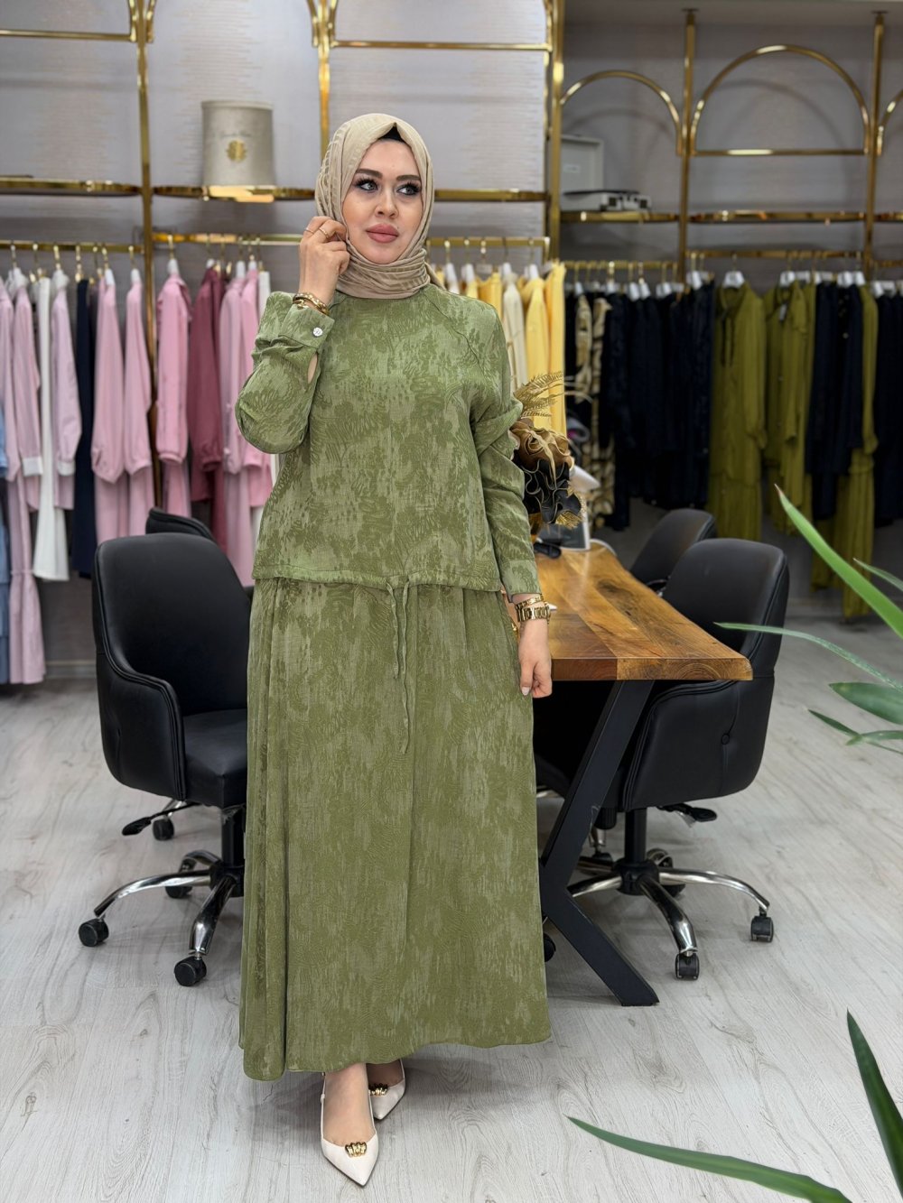 Kumaşı ipek qupradır. Tunik arkası yarım fermuarlıdır. Etek