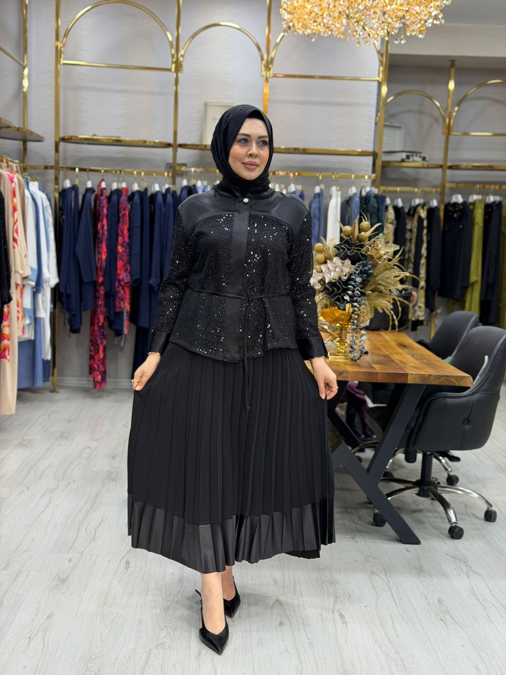 Tunik kumaşı pul payet ve kreptir. Etek kumaşı kreptir. Etek beli