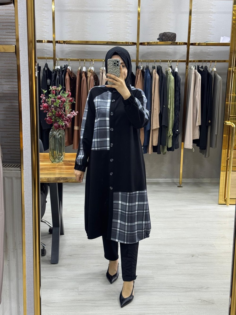 Kumaşı çeliktir. Jakar kombinlidir. Önü düğmelidir.