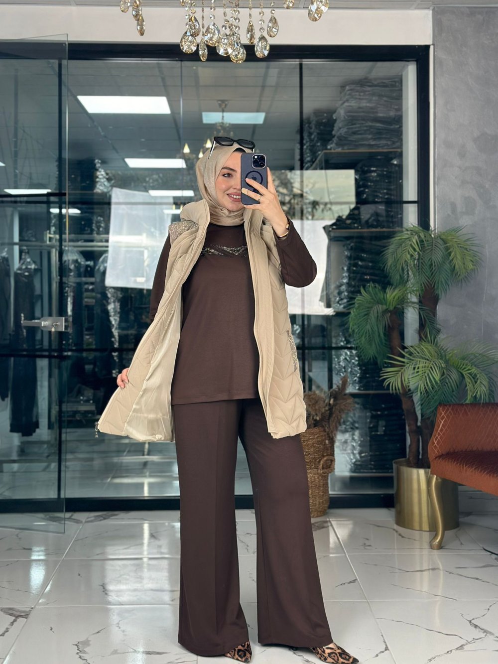 Kumaşı oyshodur. Yelek kapitonedir. Pantolon beli lastiklidir.