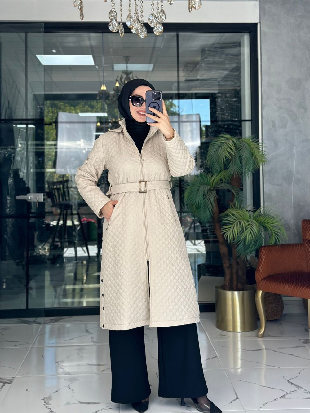 Kumaşı kapitonedir. Şapkası çıkabilir. Cepleri fermuarlıdır. Seyyar kemerlidir.